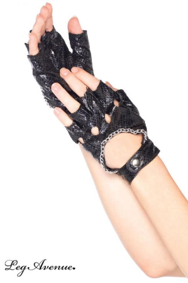 Svarta orm mönstrade korta fingerlösa handskar med tuff silvrig kedja.
