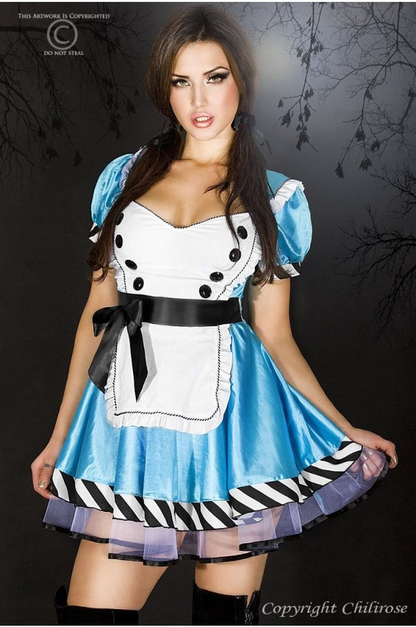 Snygg Alice klänning med satinband och rosett fram, fastsytt förkläde, lätta puffärmar. OBS! Klänningen blir supersnygg med en underkjol som ej medföljer men går att köpa till. Alla våra kostymer...