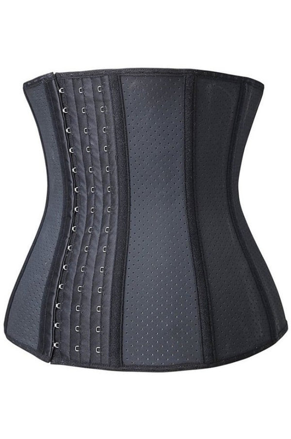 Svart perforerad träningskorsett i latex med hyskknäppning fram och 9st mjuka spiralfjädrar i metall som följsamt formar sig efter din egna midja och formar och håller in en mycket prisvärd...