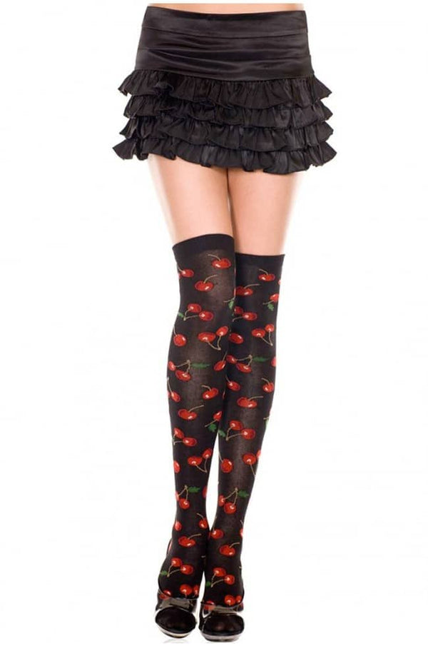 Lårhög tuff strumpa med svart botten och med körsbärsmönster, sitter bra åt runt låret. Strumpa med körsbärtryck i 80% acrylic, 17% nylon och 3% spandex, tvättas endast för hand.