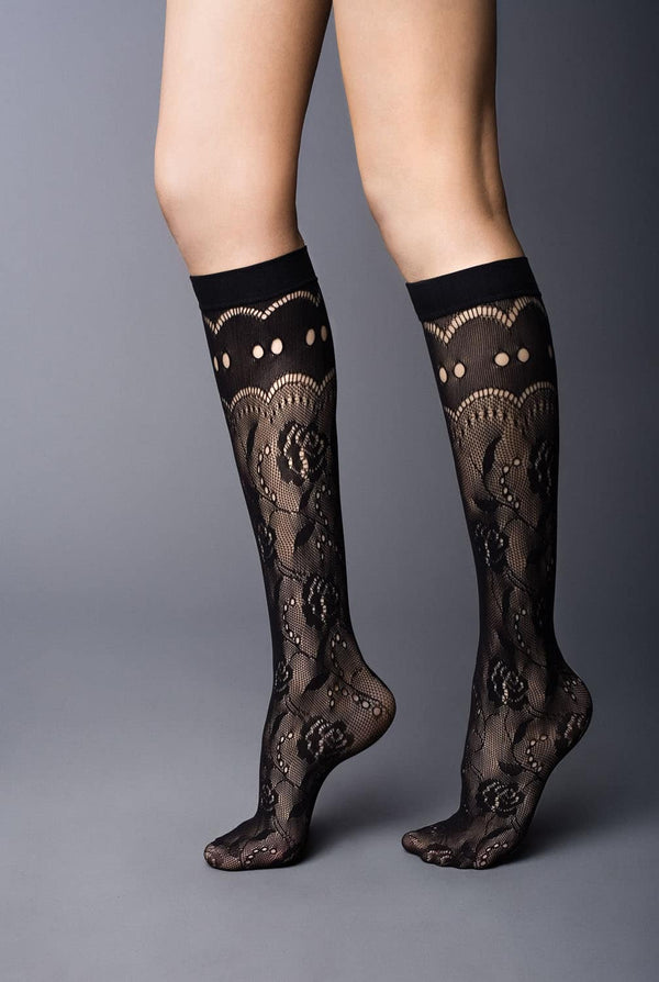 Svarta knästrumpor med fint mönster. Knästrumpor tvättas för hand, tillverkad i 90% nylon och 10% spandex.