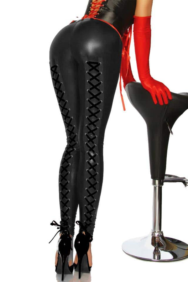 Tuffa svarta leggings i wetlook modell och med röd snörning bak. 80% polyester och 20% elastan.
