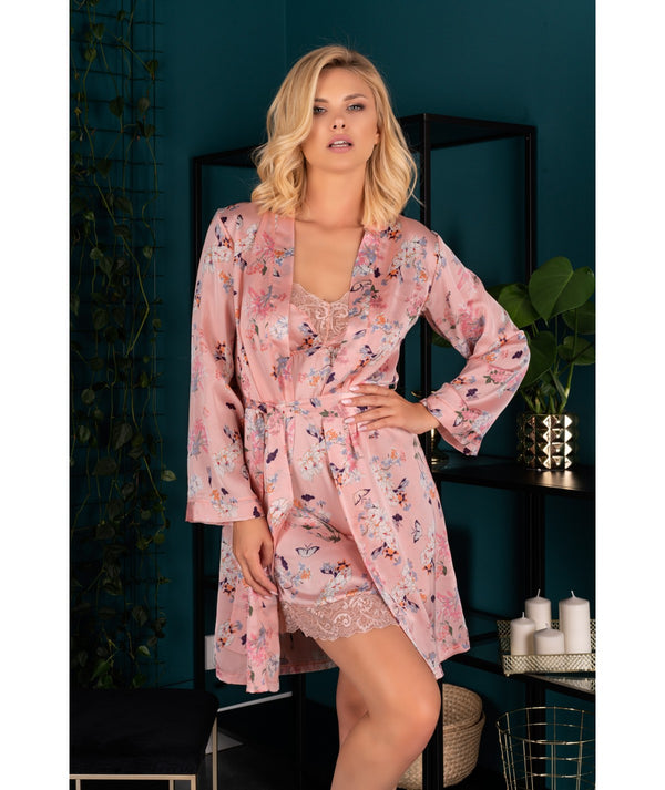 Fantastisk rosa blom mönstrad morgonrock med långa ärmar, vacker spets bak, knytband medföljer. OBS!Nattlinne eller trosa medföljer ej men finns att köpa till. Tillverkad i 100% polyester. Följ alltid tvättrådet...