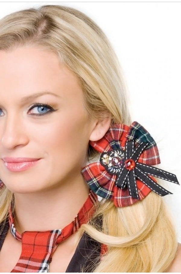 Coola och tuffa hår accessoarer att fästa i håret sätts fast med clips, rutiga rosetter med dekorations stenar på och emblem.