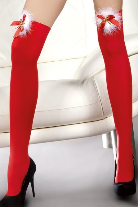 Sexig jul kroppsstrumpa i röd mjuk elastisk spets, vit maraboukant och öppen gren.