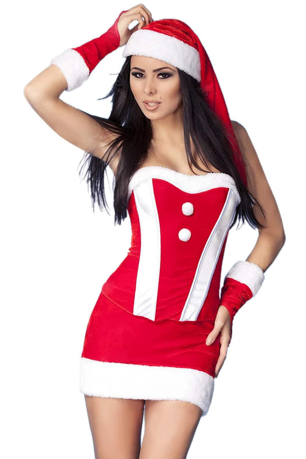 Läckert julset bestående av en mjuk bustier som knyts i bak, kort kjol, läckra handskar. Allt i skön sammet. OBS! Tomteluva medföljer ej. Tillverkad i 95% polyester och 5% spandex....