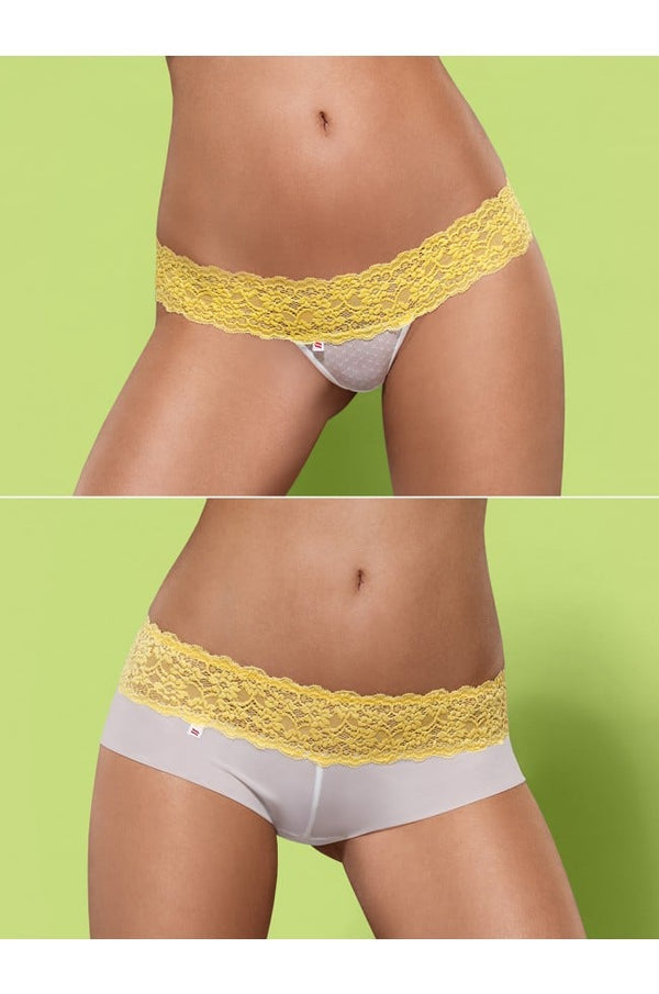 Underbara mjuka trosor en vanlig trosa i vitt och dekorativ gul spetskant samt en likadan fast i stringmodell.