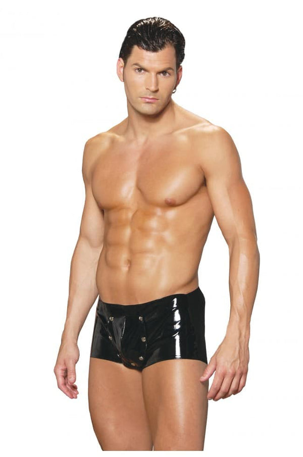 Sexig svart vinylkalsong med avtagbar front där du enkelt tar av luckan fram som sitter med tryckknappar, bakdelen av kalsongen är i mjukt strechigt material. Tillverkad i 70% polyester, 30%...