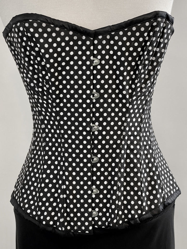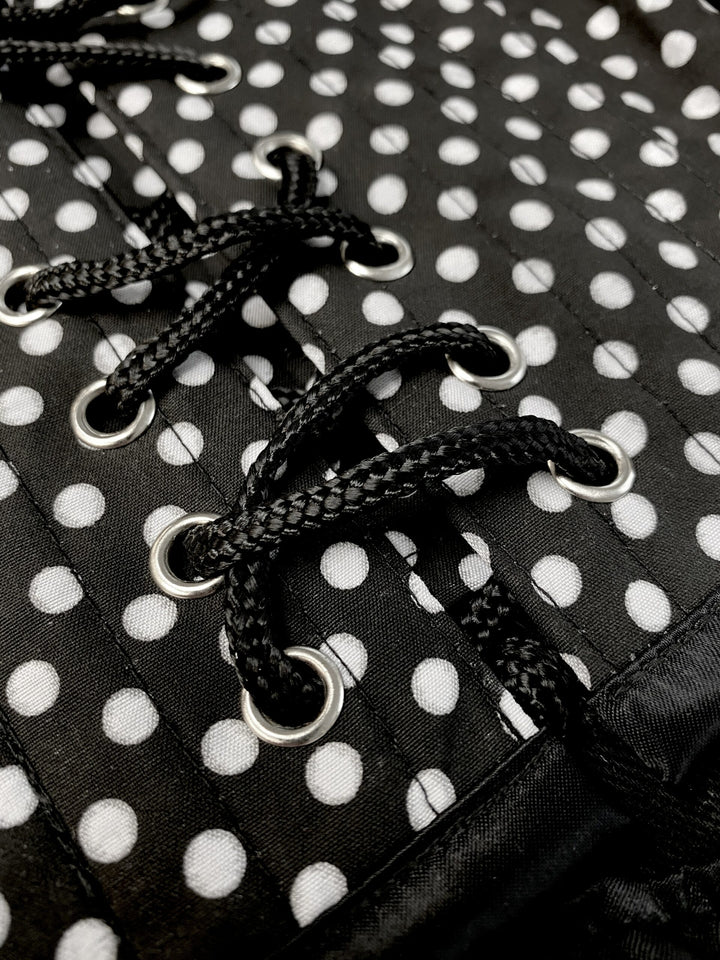 Exklusiv och axelbandslös klassisk polkadot korsett i satin med stålskenor som markerar midjan direkt och ger en otroligt fin timglasfigur. Snörning bak i ryggen denna går att snöra åt maximalt.