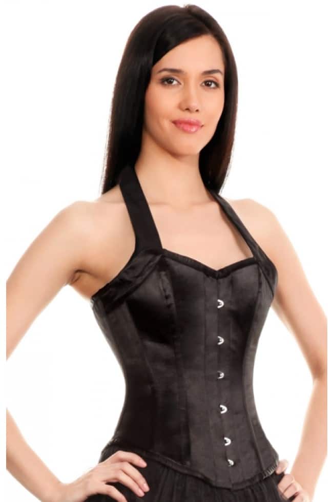 Elegant svart halterneck korsett perfekt modell för lång, medel och kort kvinnlig överkropp.