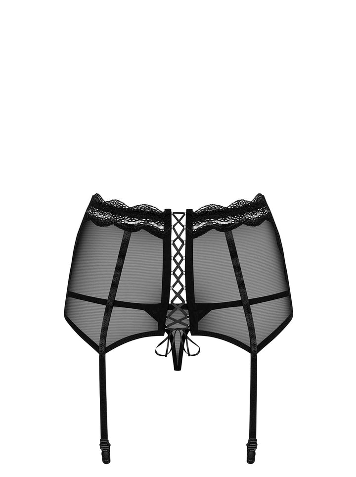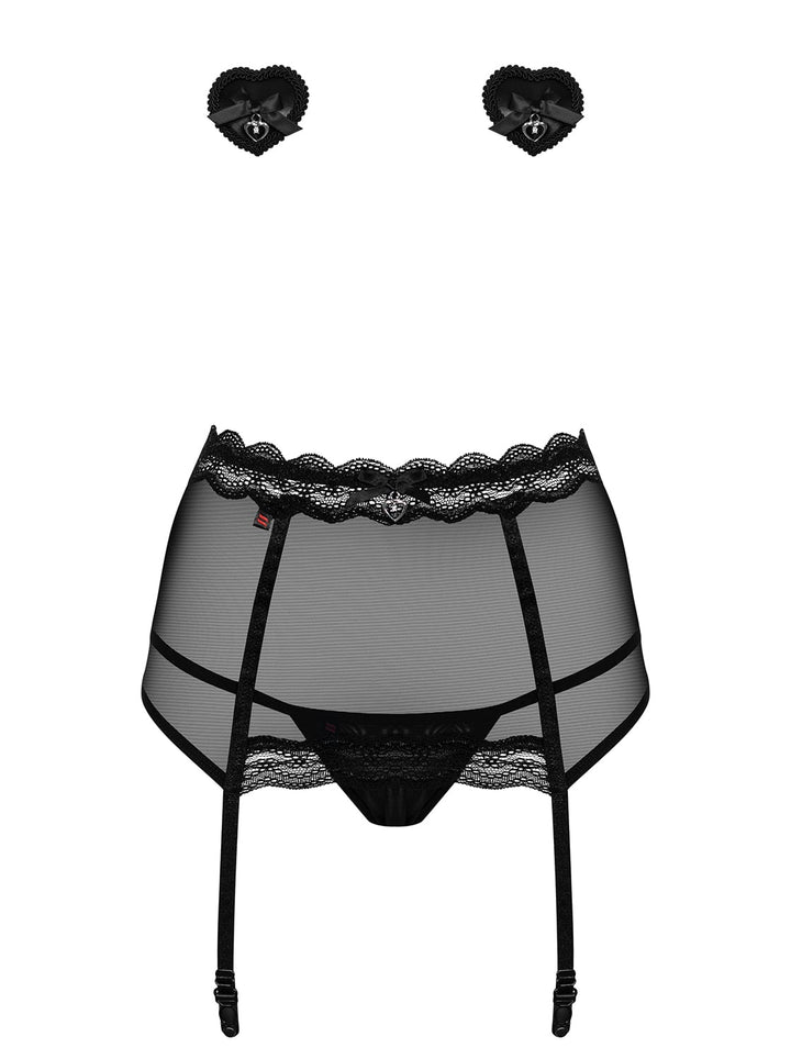 Svart sexig bred höfthållare med fin dekor, snörning bak, hänge fram i form av hjärta, fastsydda strumpebandshållare men dom är justerbara, hjärtformade självfästande nipplecovers(6 cm) , ett par matchande svarta stringtrosor.