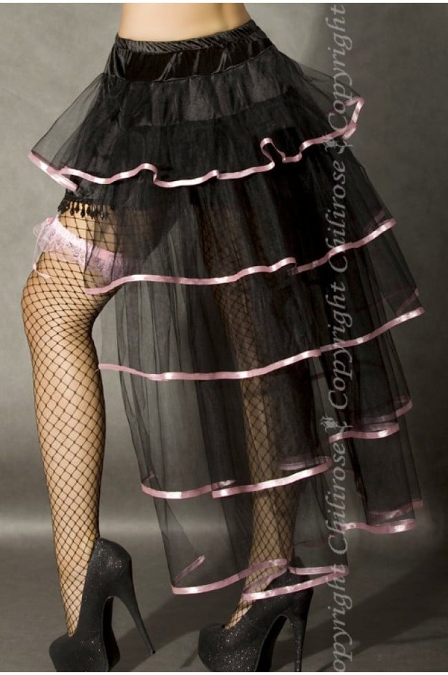 Svart burlesk inspirerad kjol som är lång baktill, med volanger och kantad med rosa satinband, stor rosa rosett bak som fin dekor, kort framtill och där är den även kantad med hängande pärlor i svart, midjan är elastisk.