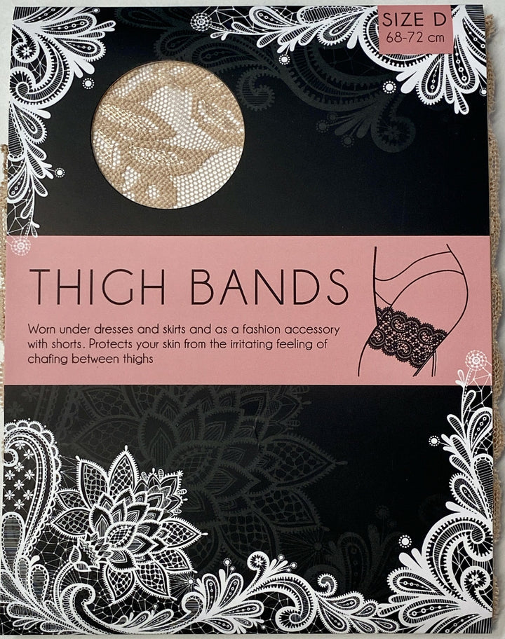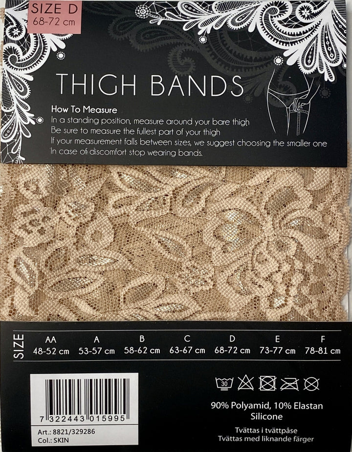 Beige smarta thigh bands i spets som skyddar huden på låren som då motverkar skav. I fin kvalité och med silikonband som gör att dessa sitter uppe hela dagen.