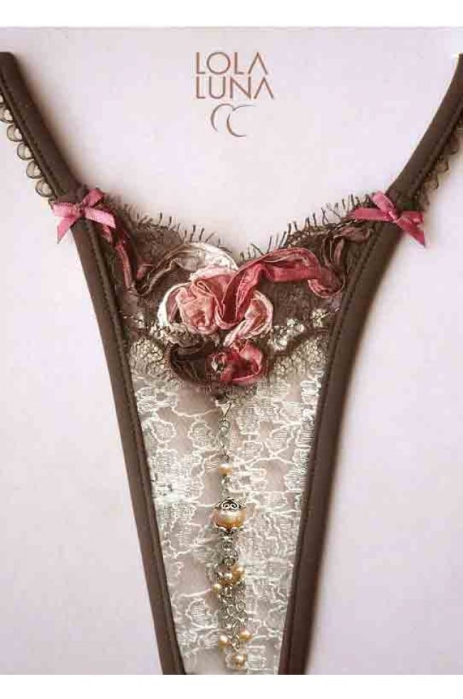 Otroligt vacker välarbetad stringtrosa Monte Carlo. Eleganta dekorationer, små rosetter, sötvattenpärla som är vackert infattad och avtagbar som du även kan använda som halssmycke medföljer gör en silverkedja. Bakstycket av stringtrosan är mycket elegant. Trosorna är tillverkade i 80% polyester och 20% elastan. Stringtrosorna bör handtvättas. Dessa förföriska lyx stringtrosor kommer från Franska LolaLuna och lämpar sig väl att ha under en klänning (om du vågar). Komplettera gärna med ett par snygga stay-up eller ett par sexiga handskar