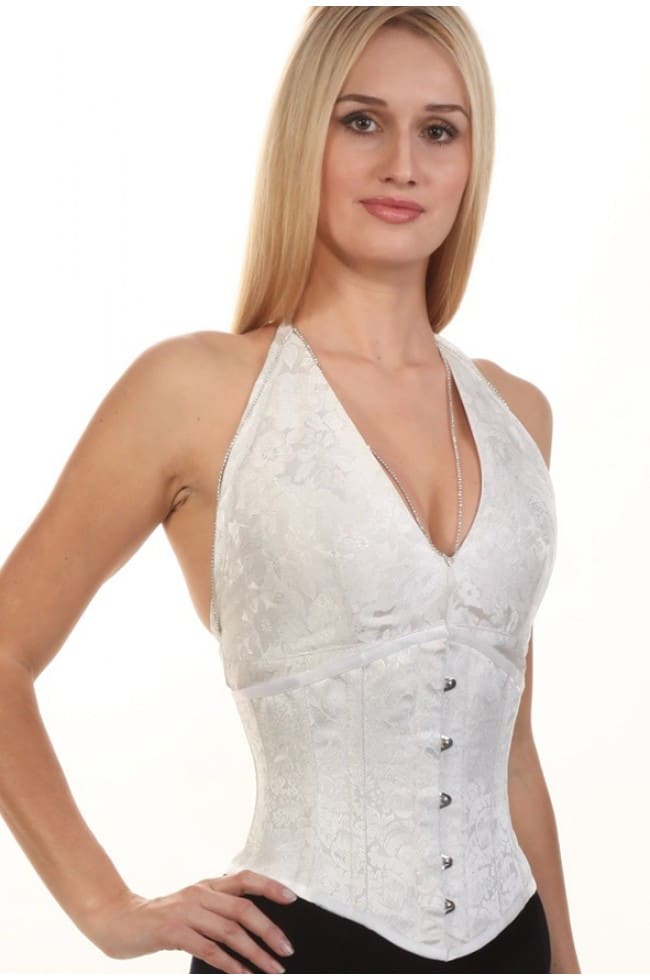 Elegant midjekorsett med vitt blommigt brokadtyg, waspiemodell med stålskenor som markerar midjan direkt och ger en otroligt fin timglasfigur.
