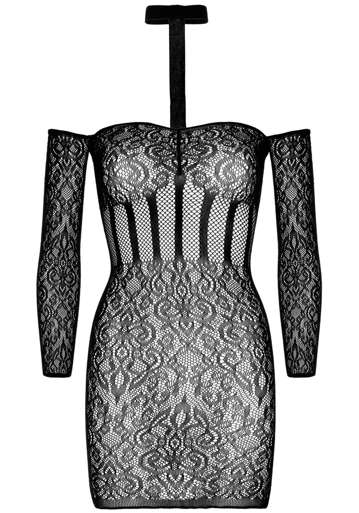 Miniklänning i svart modell med läckert mönster och chocker till halsen.
