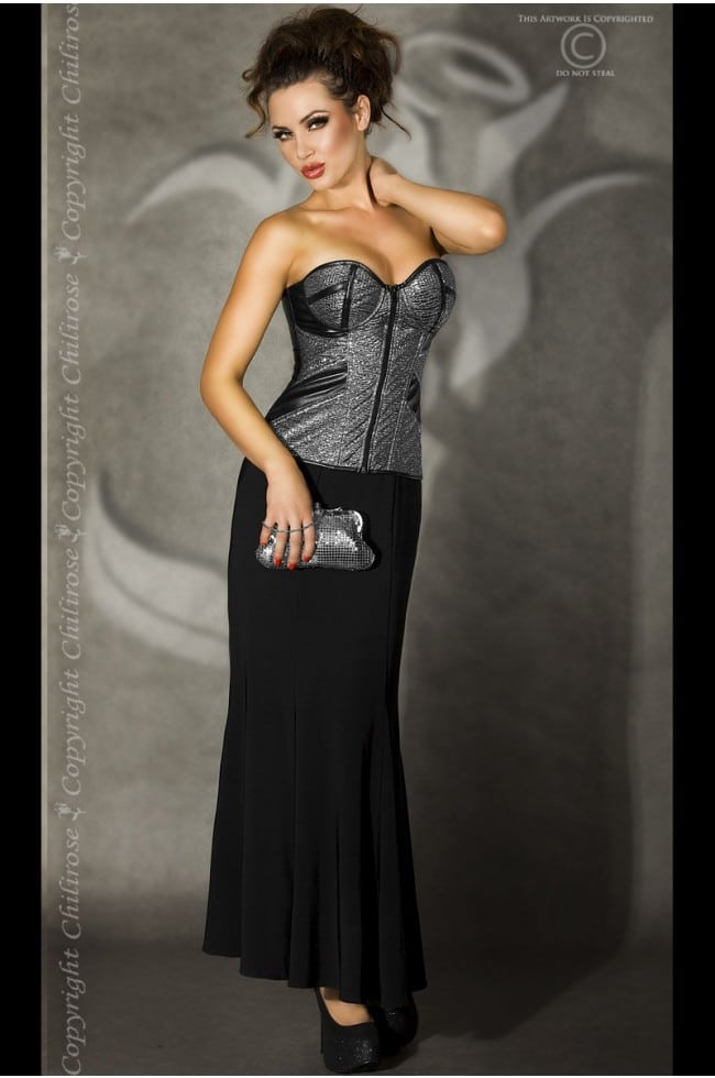 Läcker korsett i silvertyg med inslag av mjuk vinyl, svart dragkedja fram, avtagbara/reglerbara axelband, lätt vadderade kupor med stödbåge, snörning bak, ryggdelen är helt i mjuk vinyl, plastskenor runt om för bättre hållning. OBS! Kjol samt accessoarer medföljer ej. Passar lika bra till vardags eller fest mycket snygg till jeans och eller under en kavaj. Silver Queen i 65% Polyurethane och 25%cotton och 10% elastan. Handtvätt rekommenderas till detta snygga korsettset.