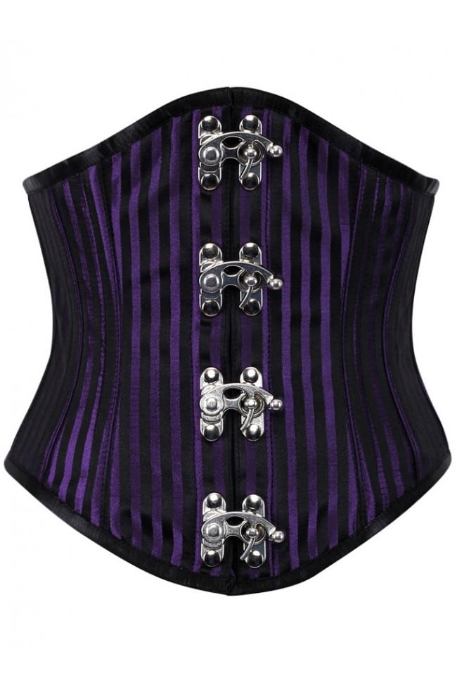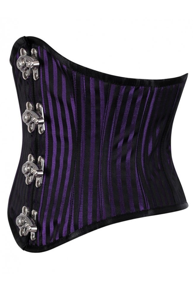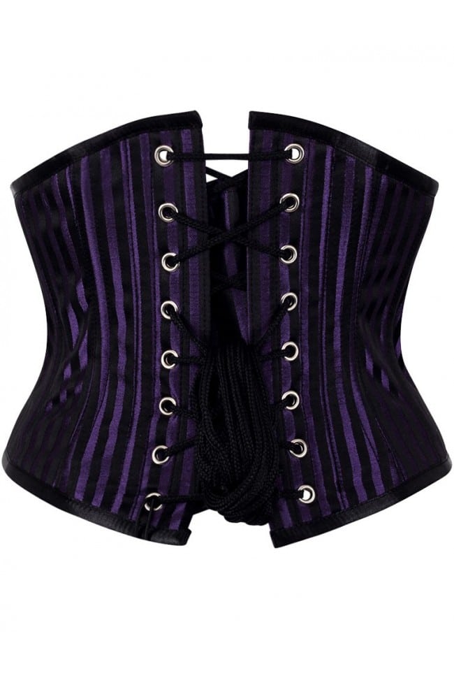 Läcker midjekorsett med lila och svarta ränder, tuff modell i härligt satintyg, silverfärgade hakar fram som knäpps, svart korsettsnöre, längden fram är ca 28 cm och bak är den ca 22 cm och den har 12 spiral skenor samt 4 platta skenor som är insydda och markerar midjan fint, öjetter vid snörningen.