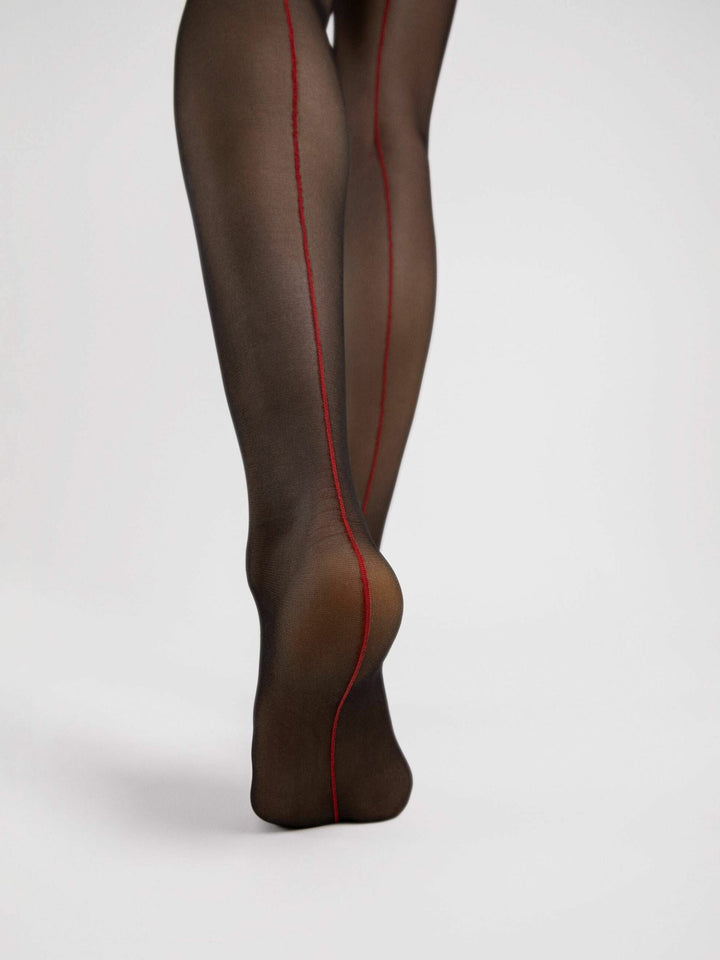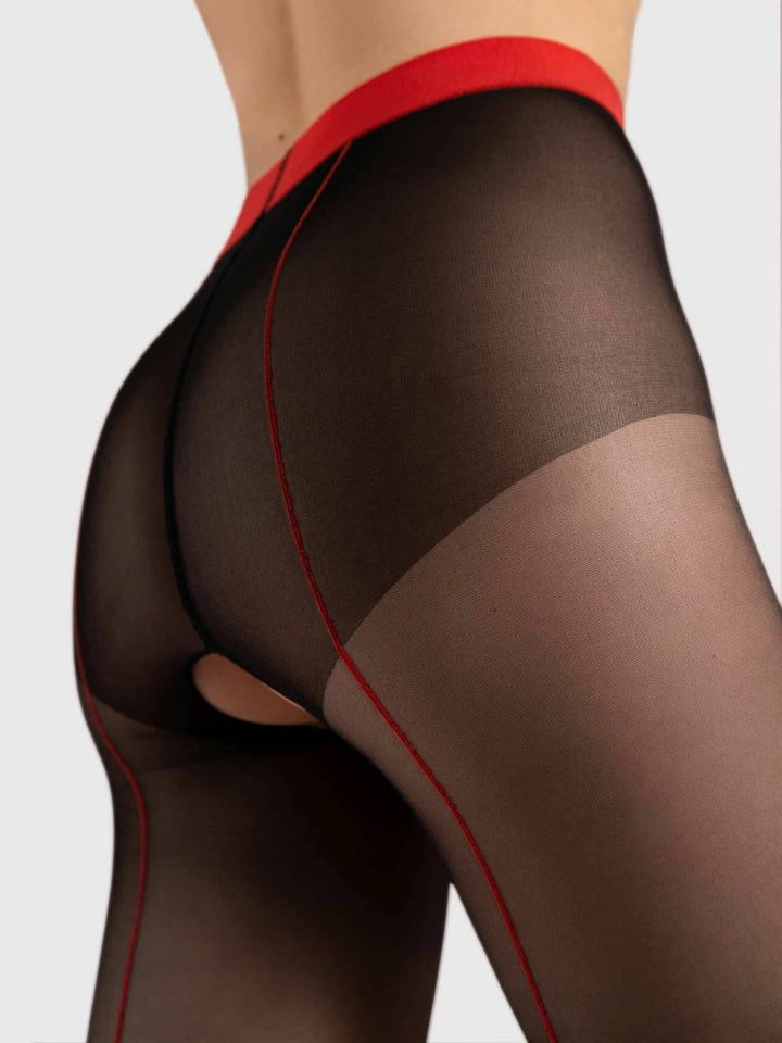 Svarta strumpbyxor i nylon med helt öppen gren och med röd baksöm.