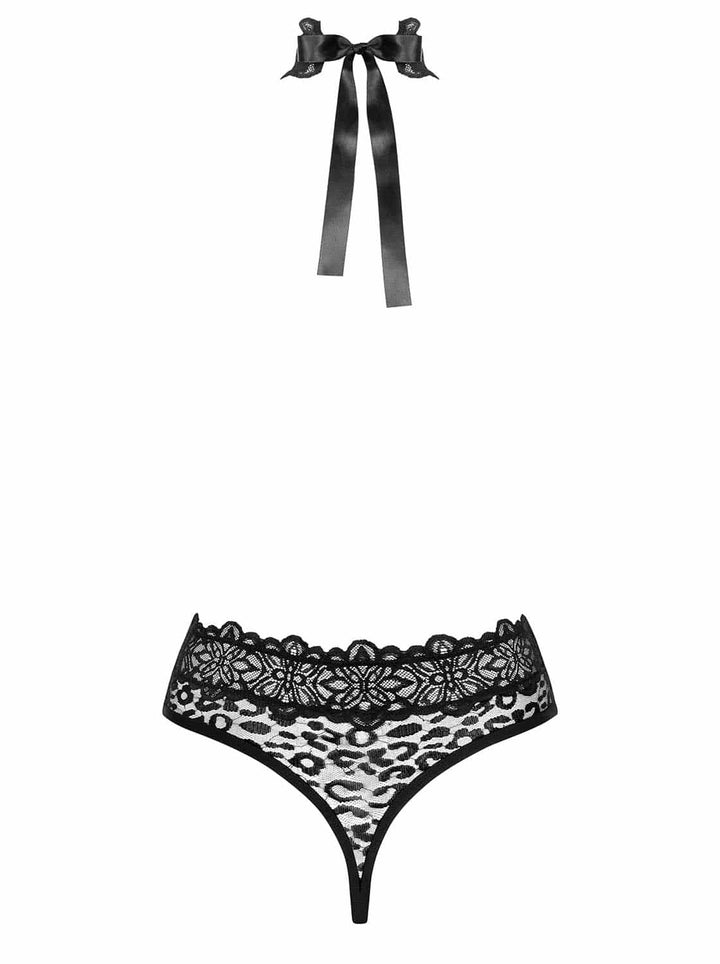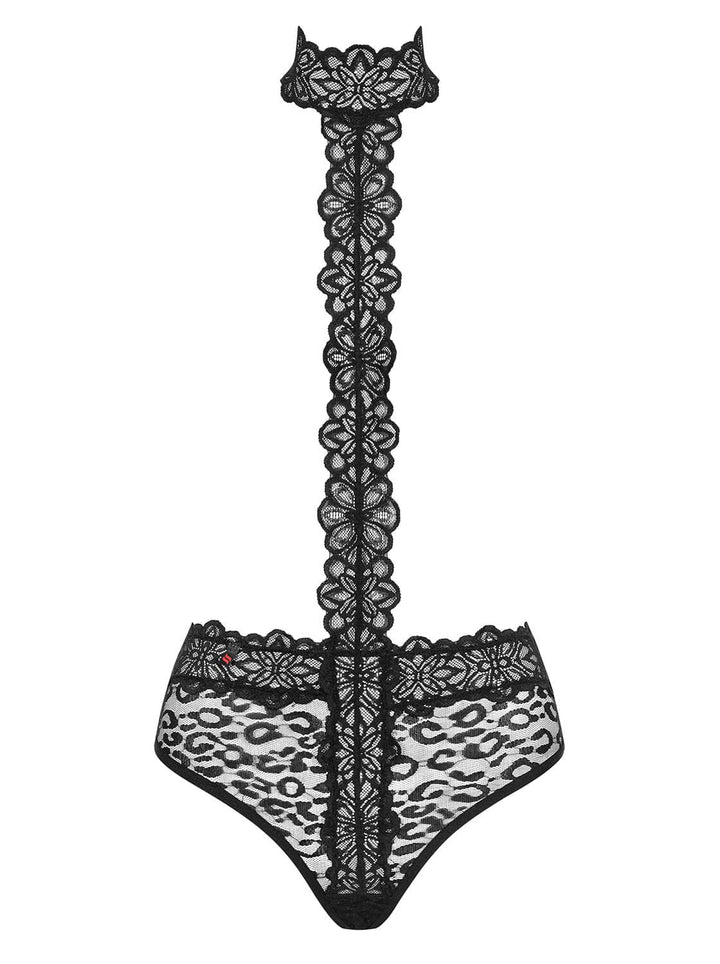Förförande sexig svart teddy med mönstrat material, dekorativ svart spets och som knyts i nacken.