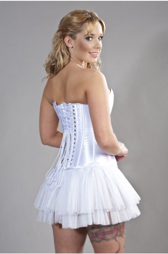Vit korsett i fin satin med lyster, planchetter fram, bra stålskenor som markerar midjan bra och ger en fin figur, snörning bak i ryggen denna korsett går att snöra åt maximalt, den är utrustad med metallskenor för maximal effekt och hållbarhet.